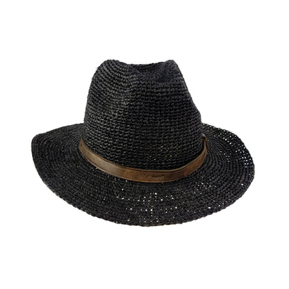 DjangoExplorez le chapeau raphia pour homme pour Django, un accessoire au style panama audacieux, mêlant l'élégance du raphia crocheté noir à une touche aventurière avec son tour en cuir.